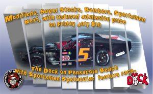 Modifieds for 50 laps, and Sportsmen going for extended laps, plus reduced ticket prices all add up to a big nite of action on July 8th.The powerful Modifieds of Mayhem are ready to take on the tricky highb anks of 5 Flags again. The Dock on Pensacola Beach Sportsmen willgo additional laps... the number of laps depends on the car count.