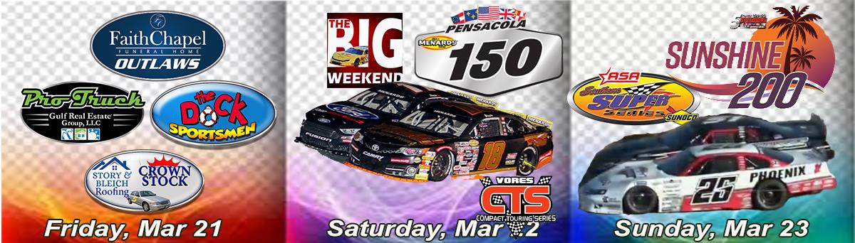 The ARCA Menards Series East (Pensacola 150) and the four-cylinder Vore’s Compact Touring Series (Pest Doctor Bash at the Beach 40) continue the action Saturday night with the ASA STARS National Tour (Sunshine State 200) wrapping up the action Sunday afternoon.