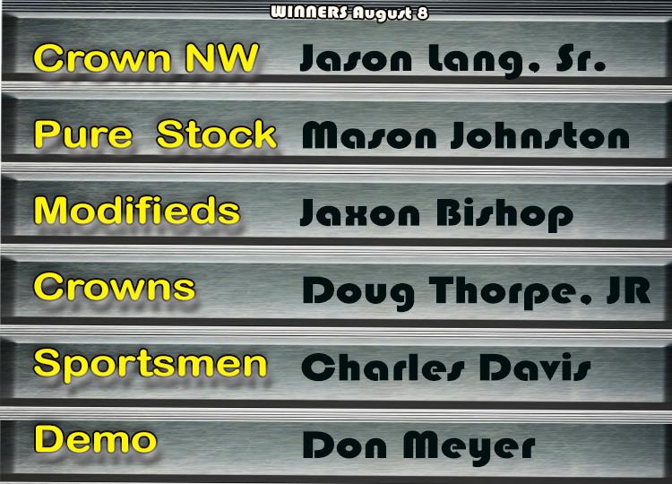 Johnston Wins 6th Straight Pure Stock race, Jaxon Bishop Takes Mod 50, Thorpe in Crowns, Davis wins Sportsmen; Don Meyer Wins Demo Derby..
